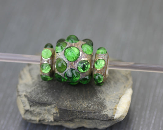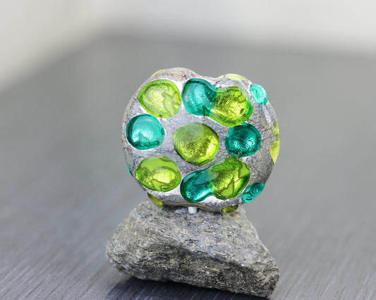 Perles de verre d'Anne Londez inspirées des flaques d'eau dans les rochers, qui incoporent de la feuille d'argent fin au verre fondu.