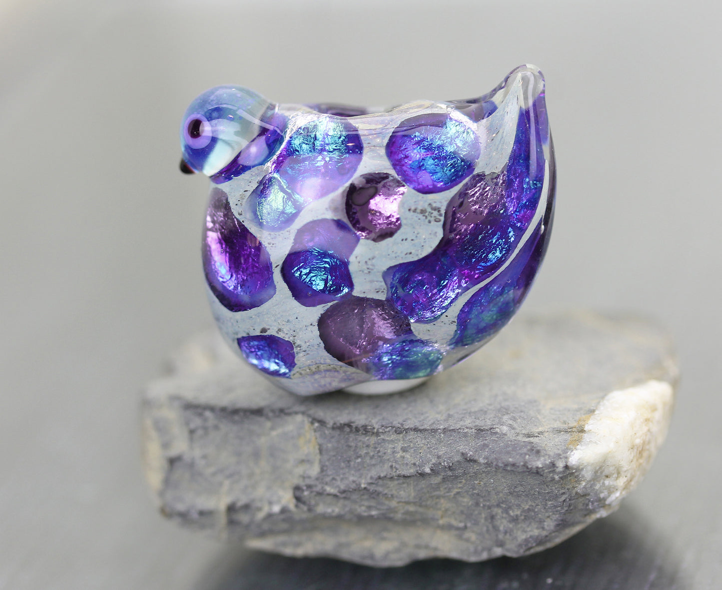 Sea Rocks bird focal bead in dark cobalt blue and purple tones, with silver leaf sparkling under the blue glass. The bead is encased in a thick layer of clear glass.