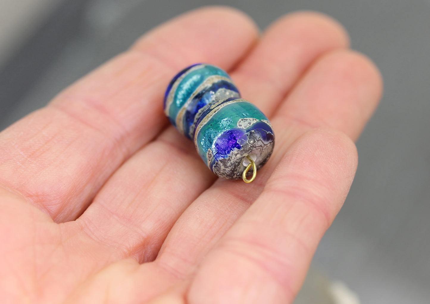 Pair of striped Sea Rocks beads with a turquoise central stripe with aqua accents and two cobalt blue side stripes. The central stripe is more aqua where there is silver leaf underneath it, more turquoise where the silver has been melted in.