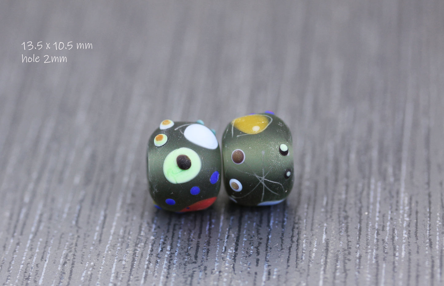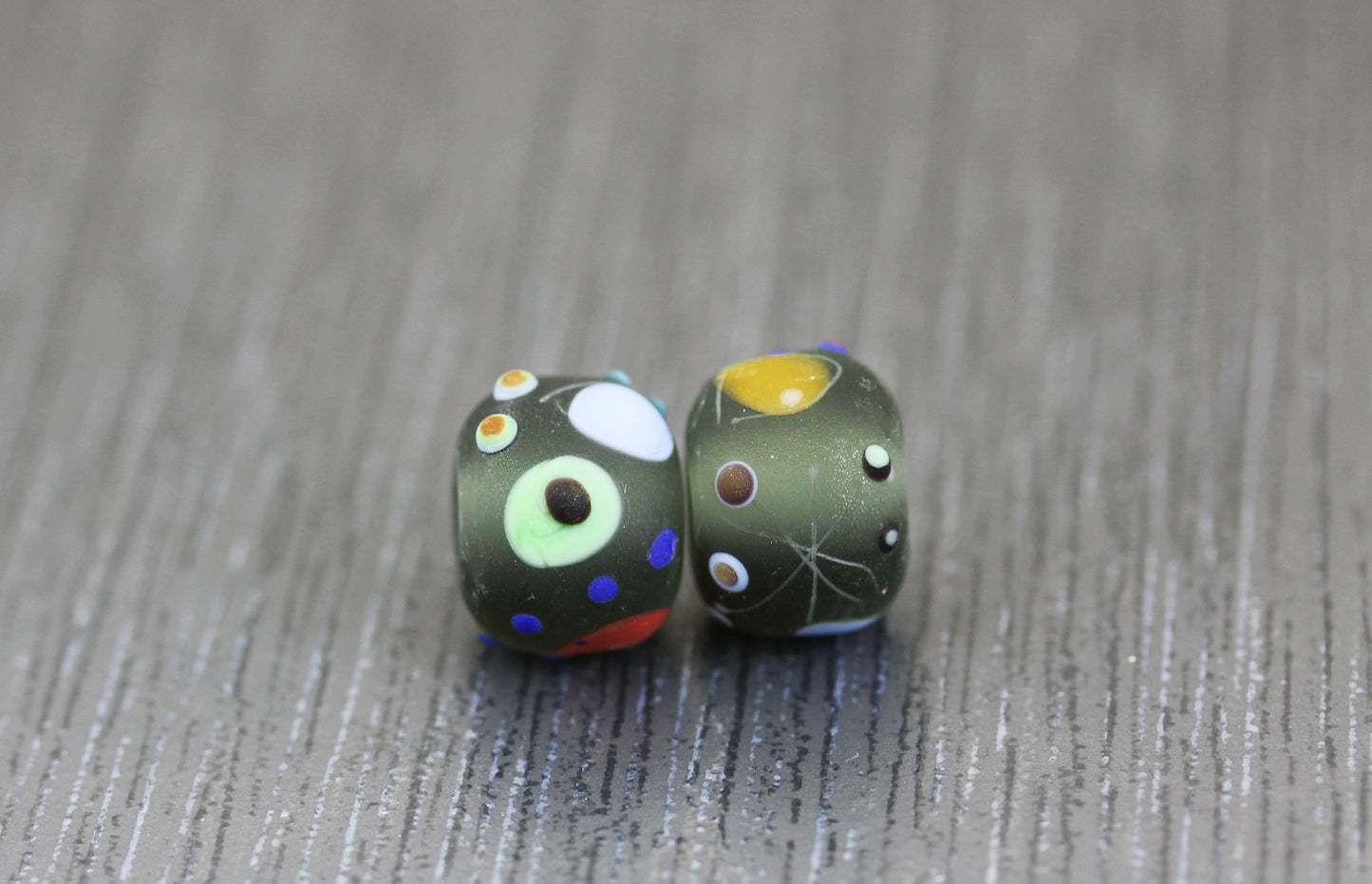 Pair of translucent gray beads from my Miro collection, decorated with colorful patterns. Each bead has its own personality, no two are identical. The glass is etched for a smooth matte finish. Perfect for earrings!