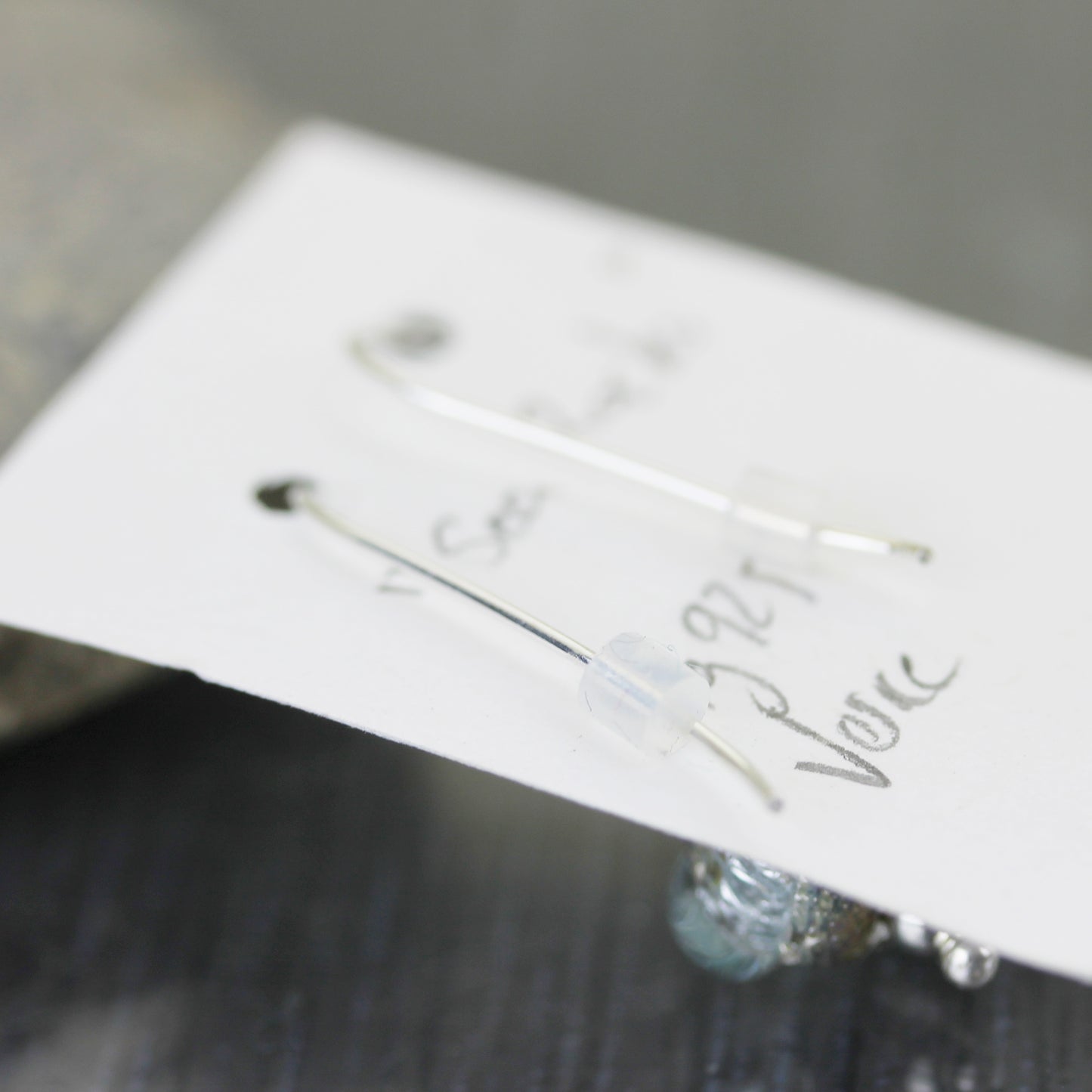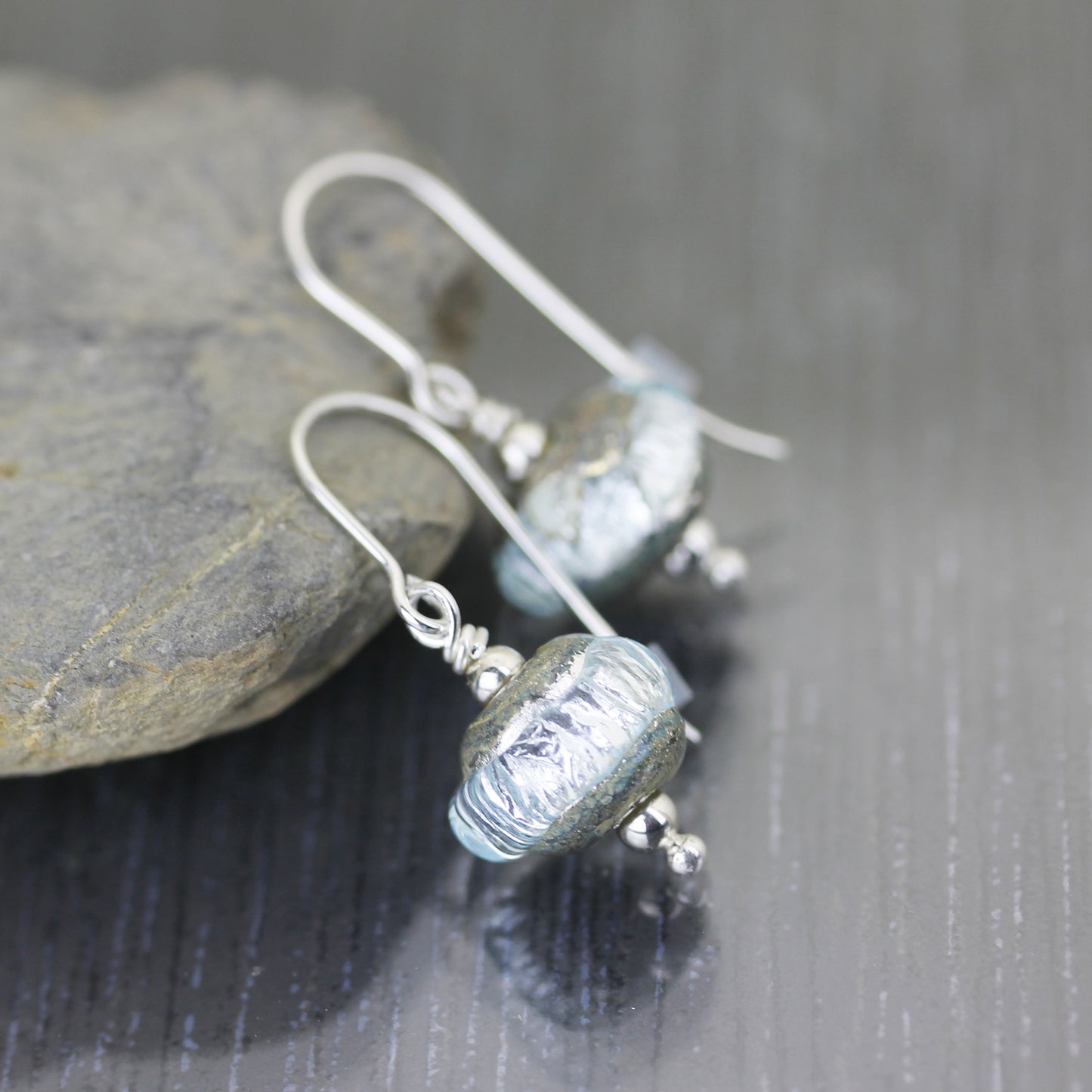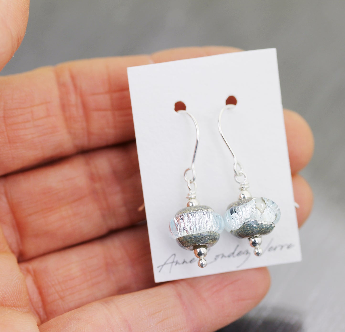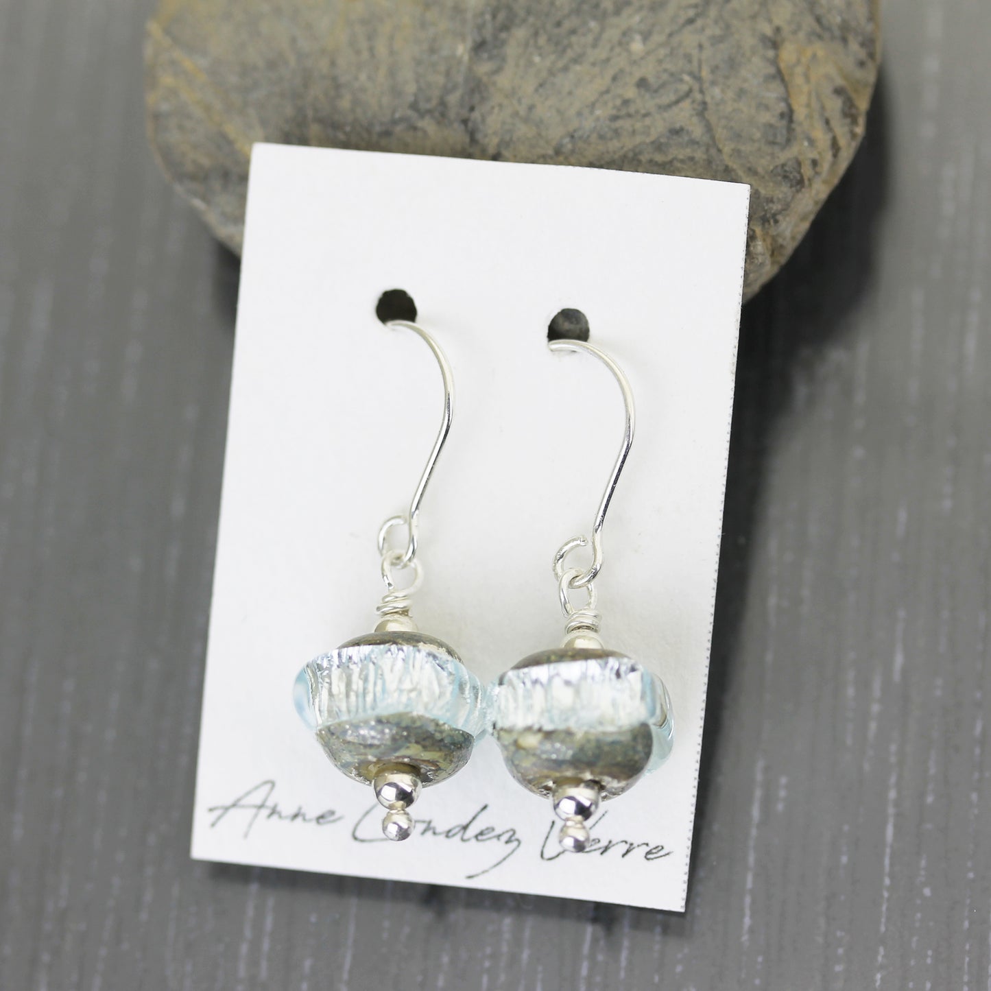 Captez la lumière avec ces boucles d'oreilles de ma collection Sea Rocks, dans les tons blancs légèrement bleutés de la glace. Cette collection est inspirée par les flaques d'eau dans les rochers, au bord de la mer. Le verre est travaillé avec de la feuille d'argent, qui donne l'aspect de la pierre et les reflets métalliques.