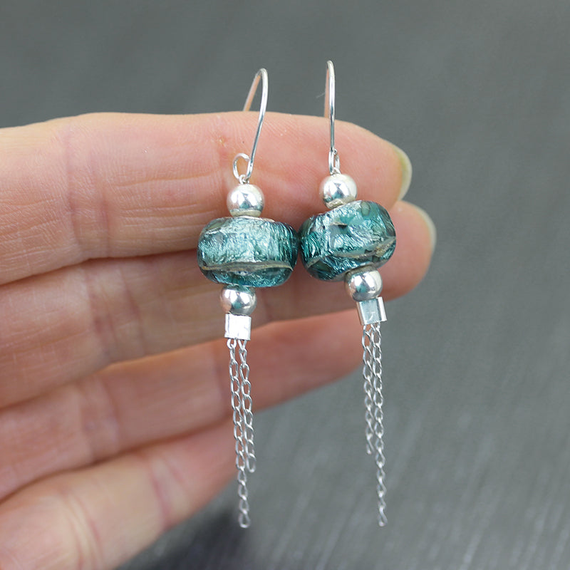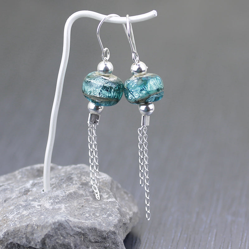 Trendy Sterling silver and glass earrings from the Sea Rocks collection with slate blue beads on a rock-gray background and long 925 silver chains. Fine silver sparkles under the blue glass.