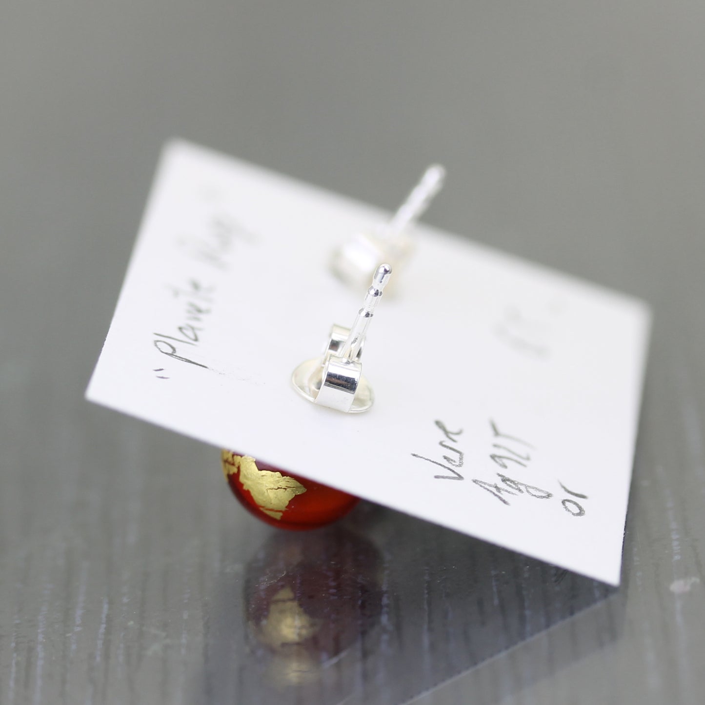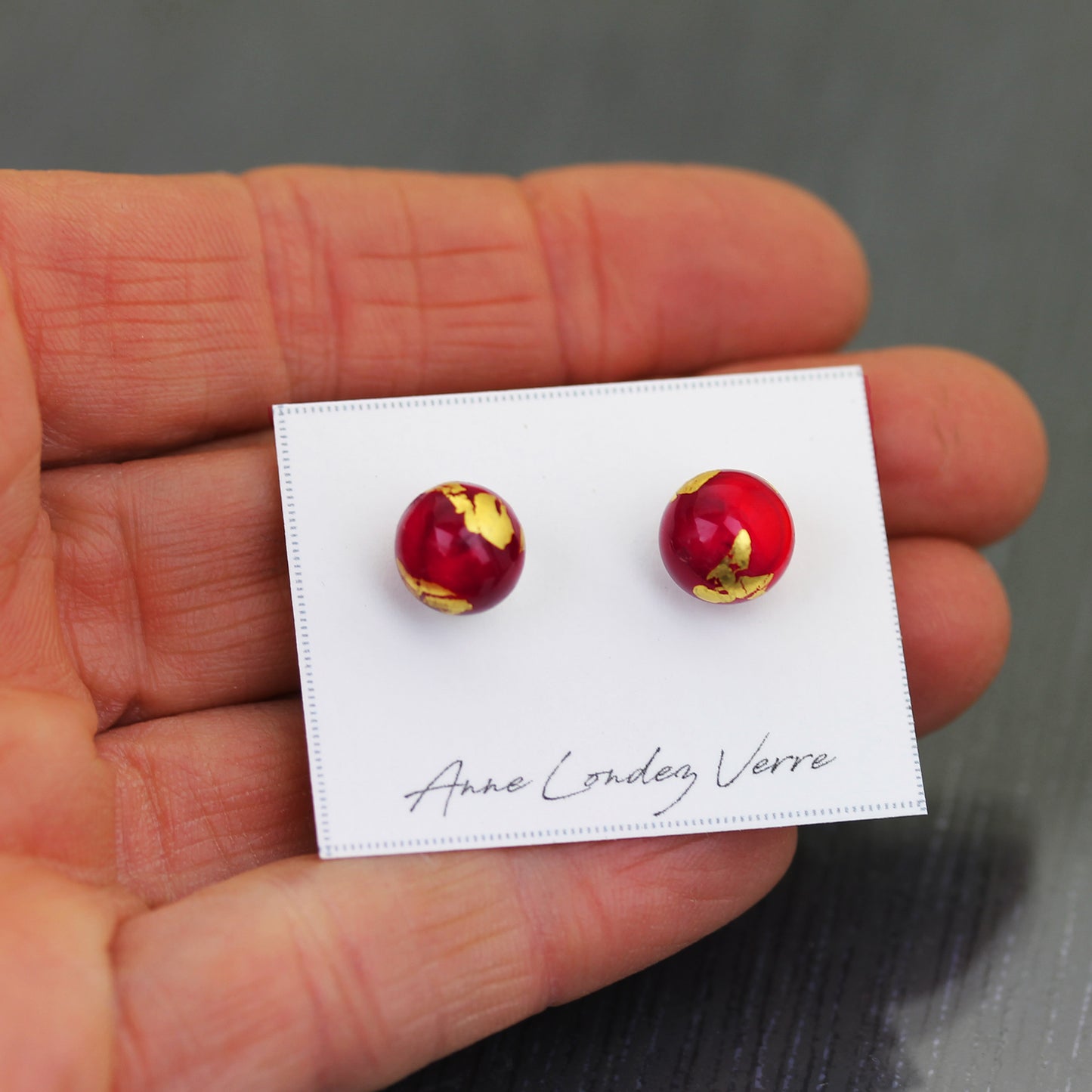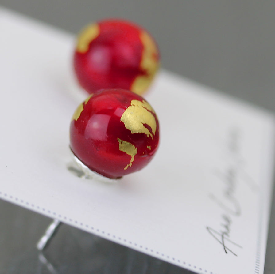 Clous d'oreilles de la collection "Planète Rouge", composées d'une base en verre opaque rouge opaque légèrement marbré et de décorations à la feuille d'or 24 carats.