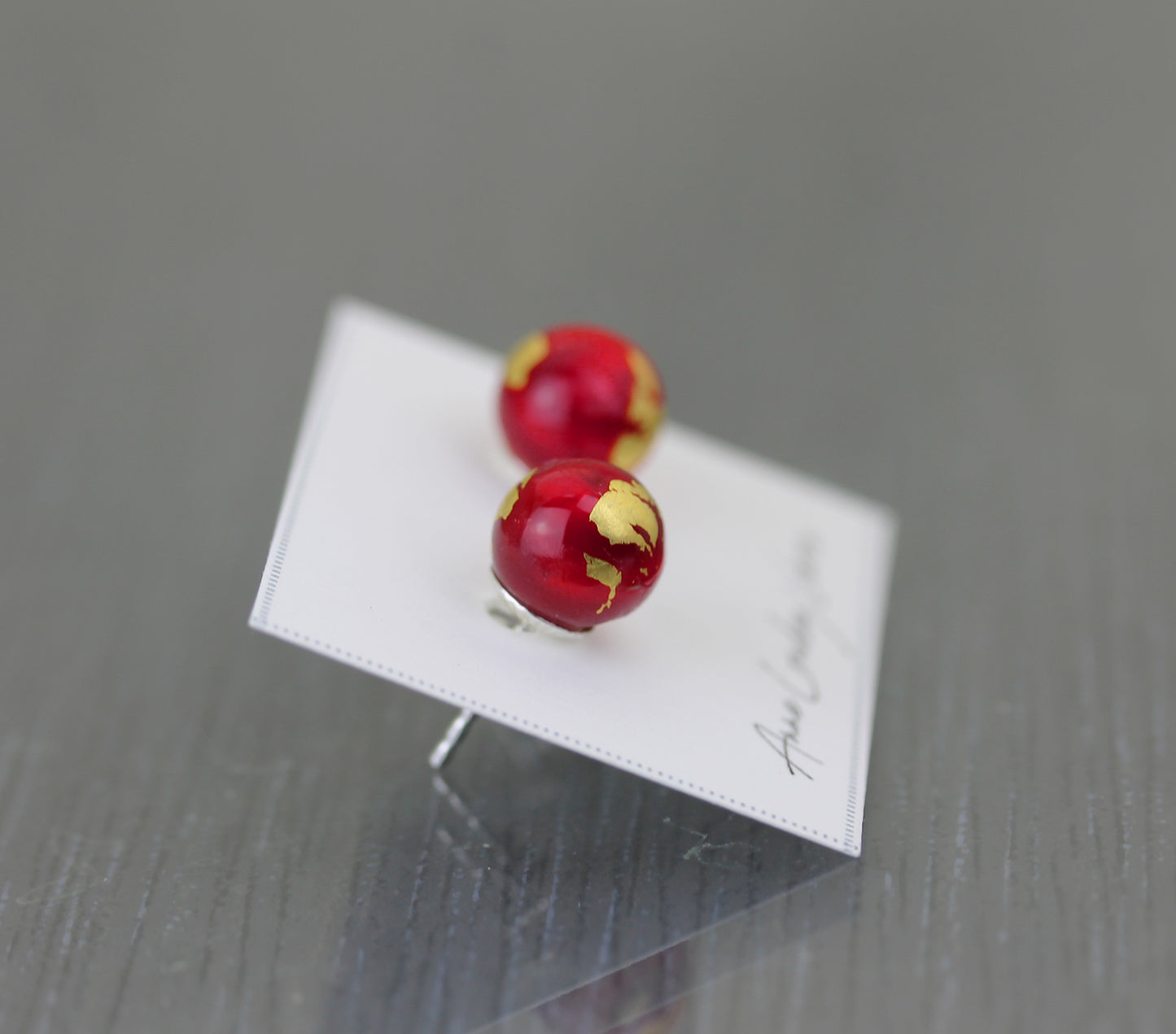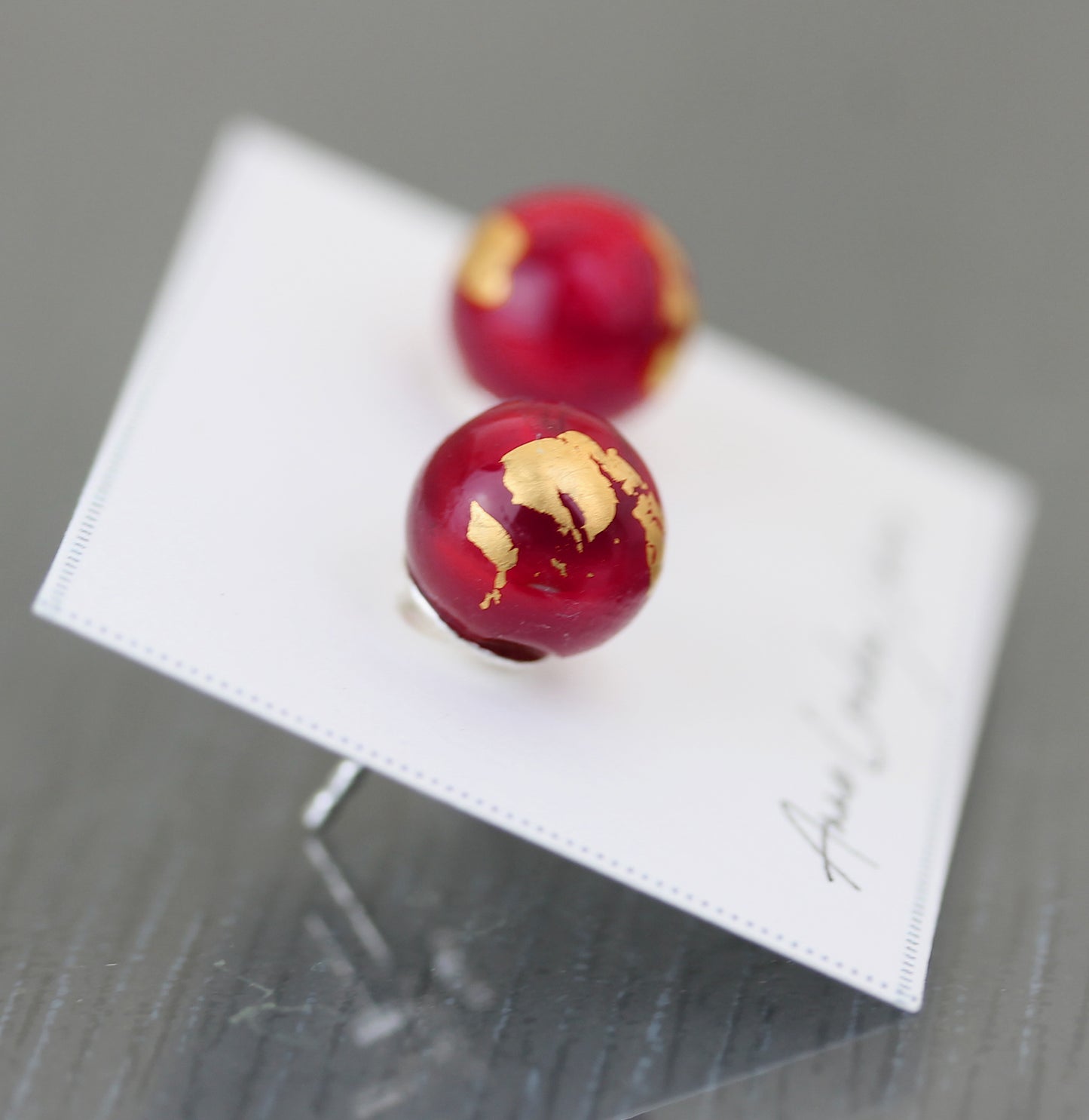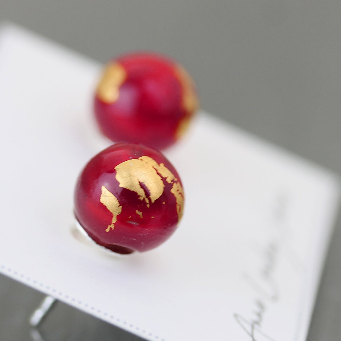Clous d'oreilles de la collection "Planète Rouge", composées d'une base en verre opaque rouge opaque légèrement marbré et de décorations à la feuille d'or 24 carats.