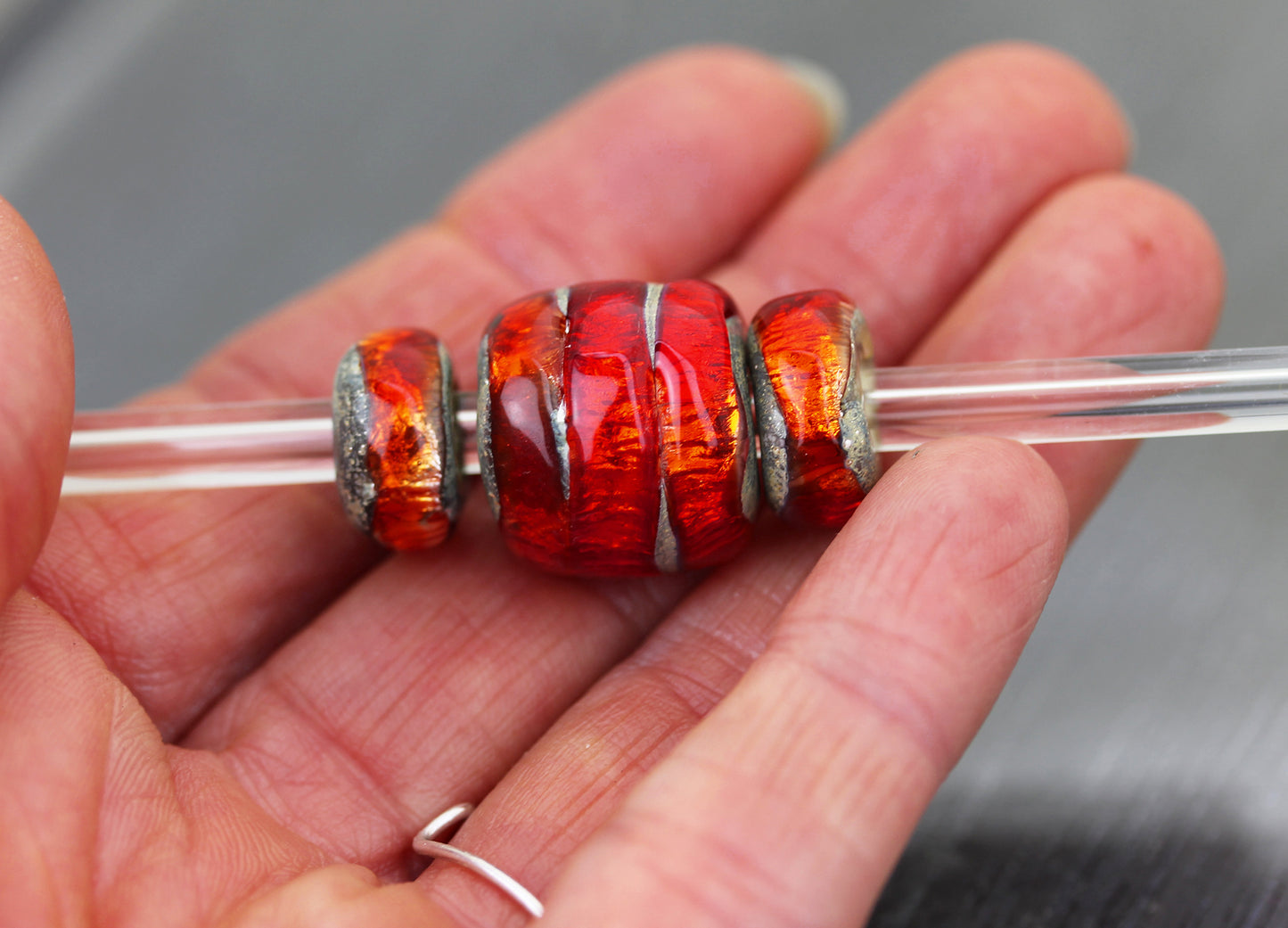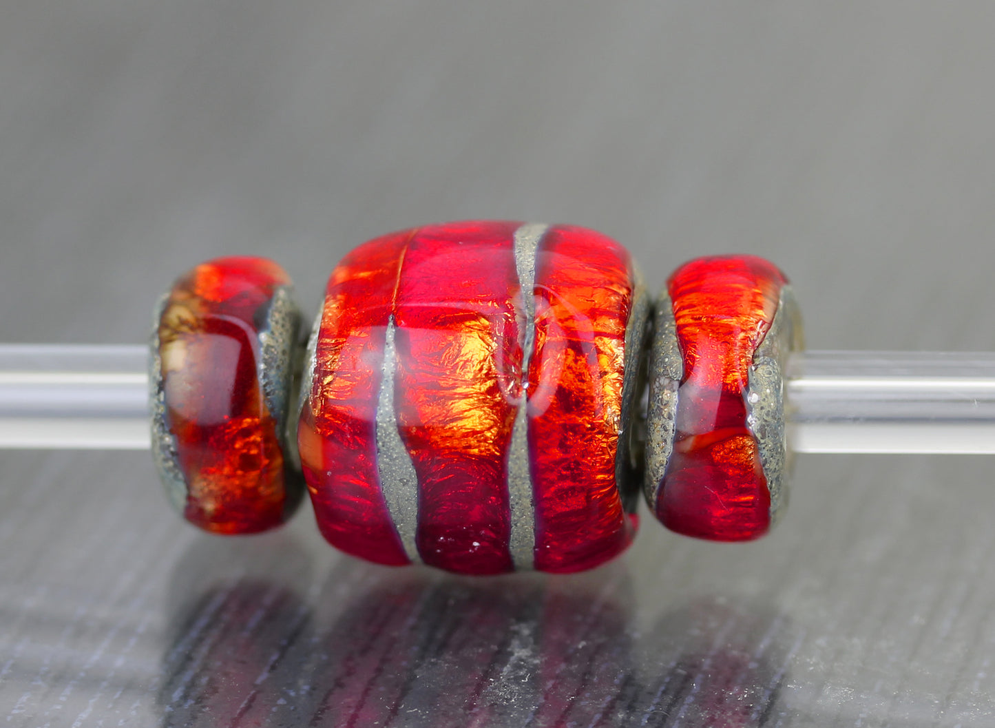 Set of 3 large hole beads in a dark fiery red orange color from the Sea rocks collection, comprising a focal and two rondelle beads in a matching pattern.