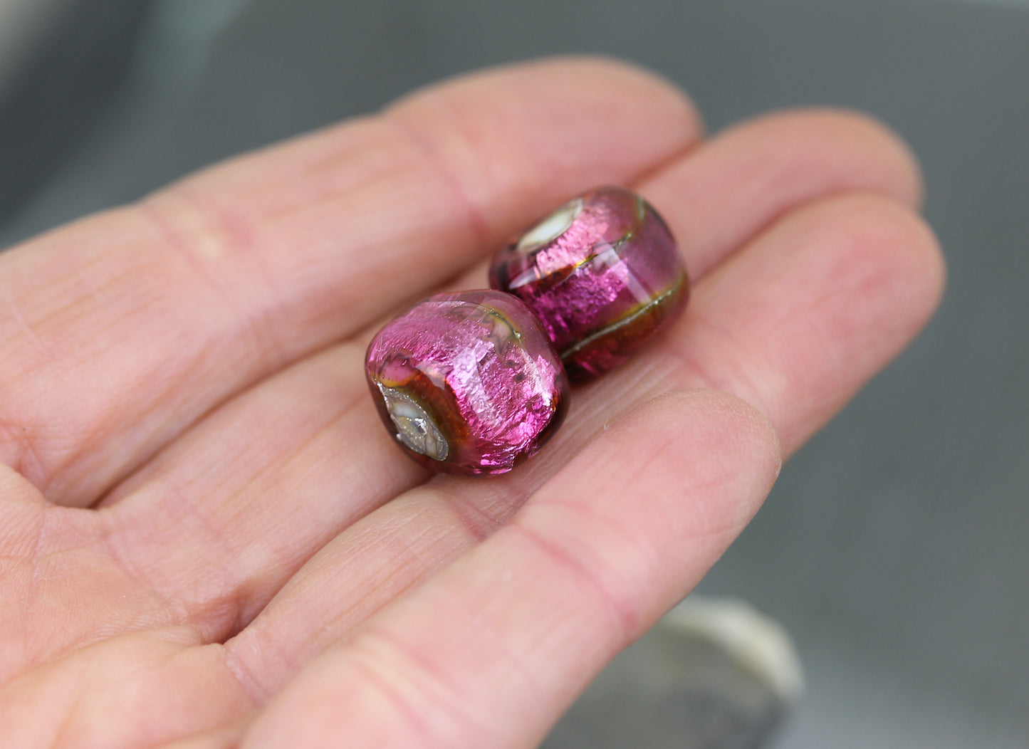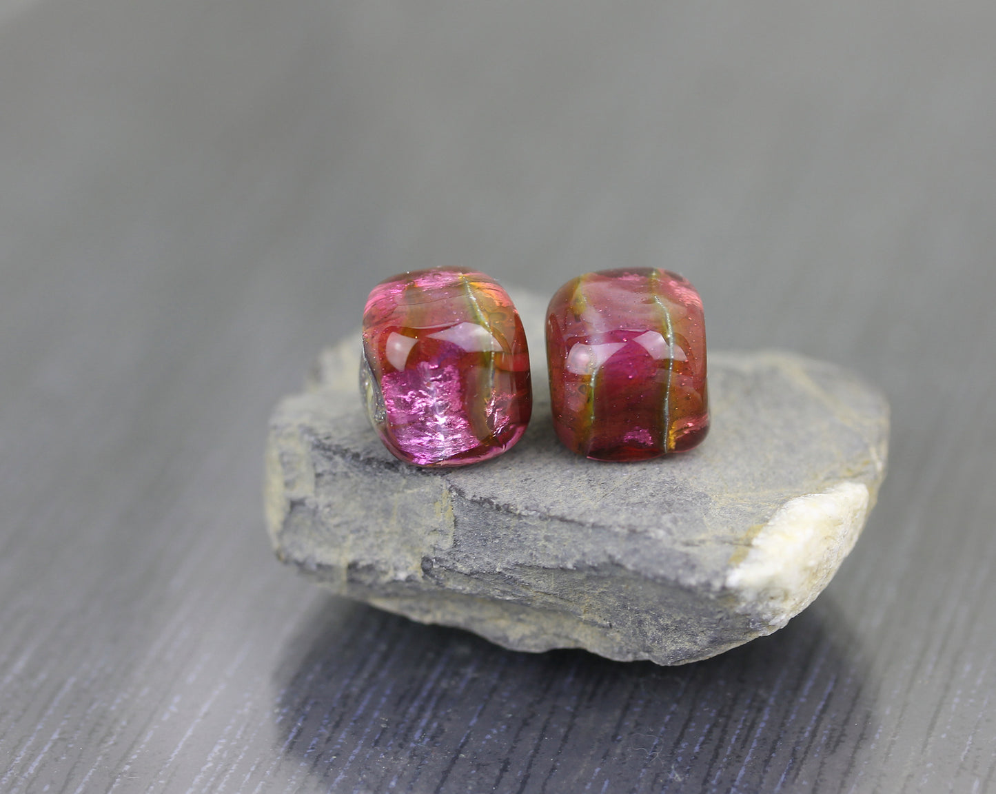 Pair of dice-shaped Sea Rocks beads in a dark hot pink with dark peach reflections. The glass is more pink where the silver leaf underneath is shiny, darker where it is melted in.