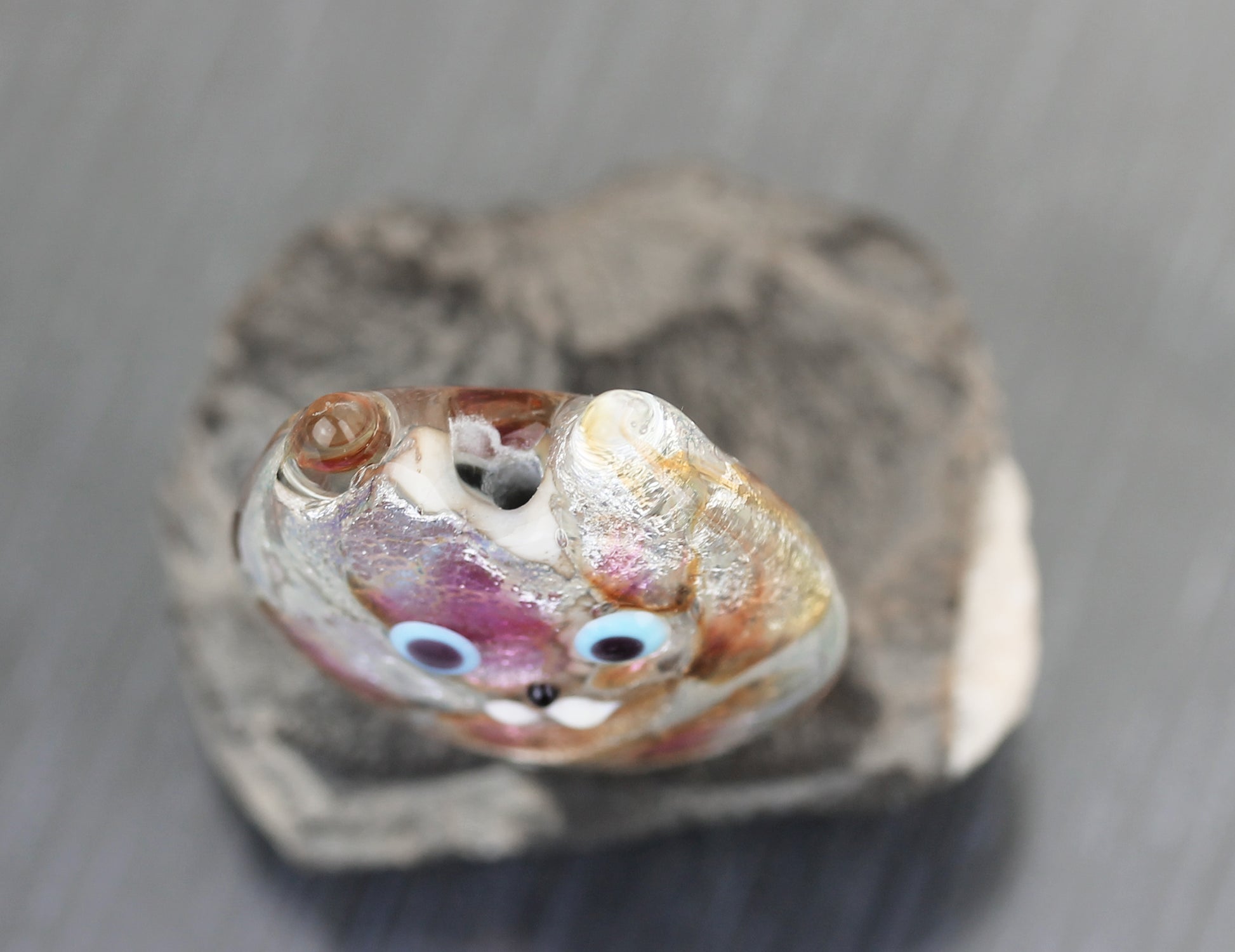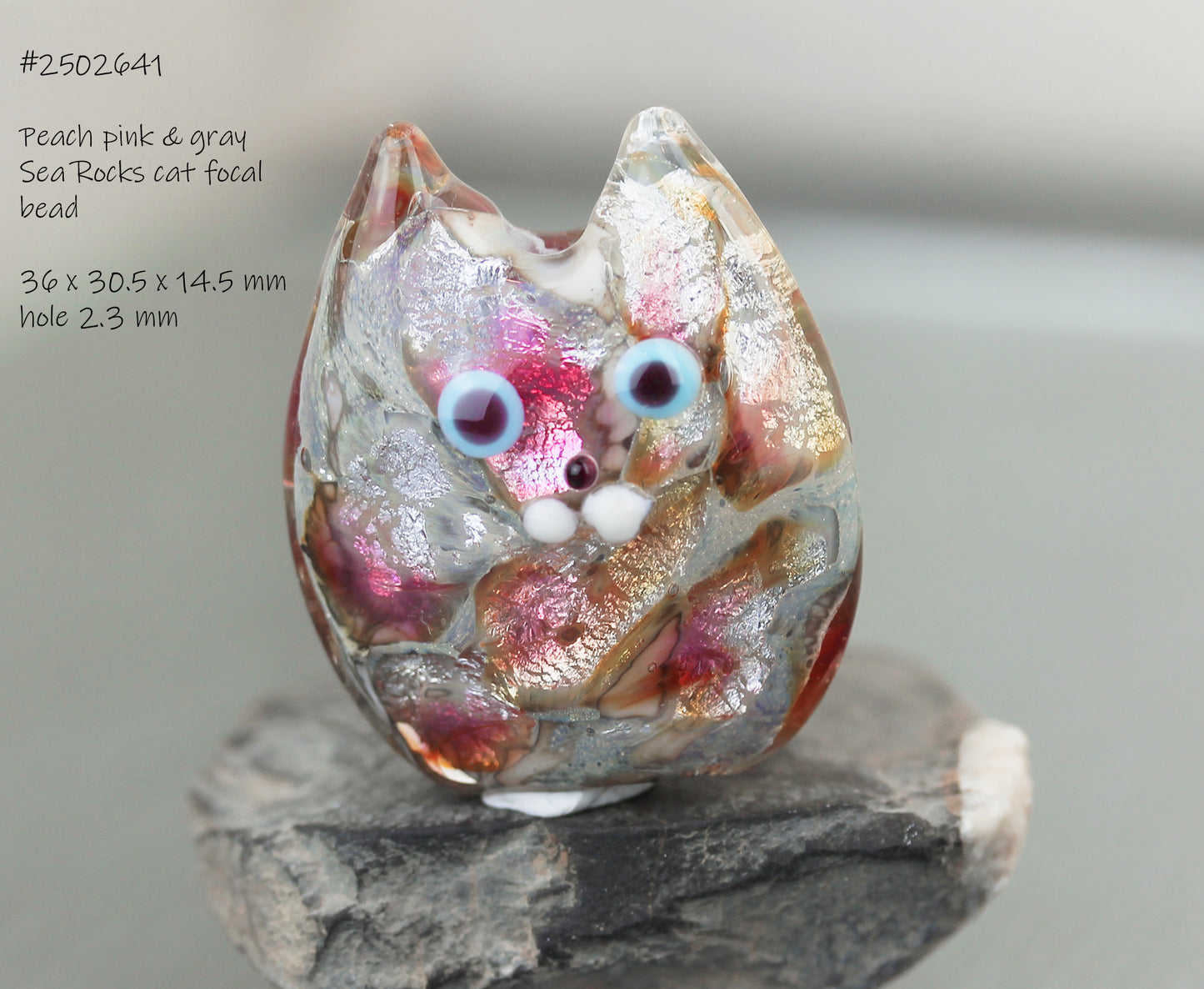 Perle de verre en forme de chat. Elle est constituée d'une base de couleur gris-beige, qui ressemble à de la pierre grâce à l'incorporation de feuille d'argent fin, décorée d'inclusions de verres transparents pêche, gris argenté et rose pâle. Elle est enchâssée dans une épaisse couche de verre transparent. La surface est décorée de verre opaque pour figurer les yeux et les moustaches. La feuille d'argent scintille sous le verre coloré. Le visage est dessiné d'un seul côté de la perle, le dos n'a pas de motif, ce qui vous donne deux perles en une.