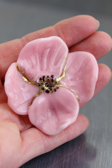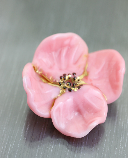 Grande fleur sculptée en verre rose et or. Cette perle est issue de ma collection Tropicale. La base est un verre un peu laiteux, légèrement opalescent. Le centre de la fleur est noir et accentué d'or fin. Parfaite pour un collier spectaculaire sur le thème de la nature.