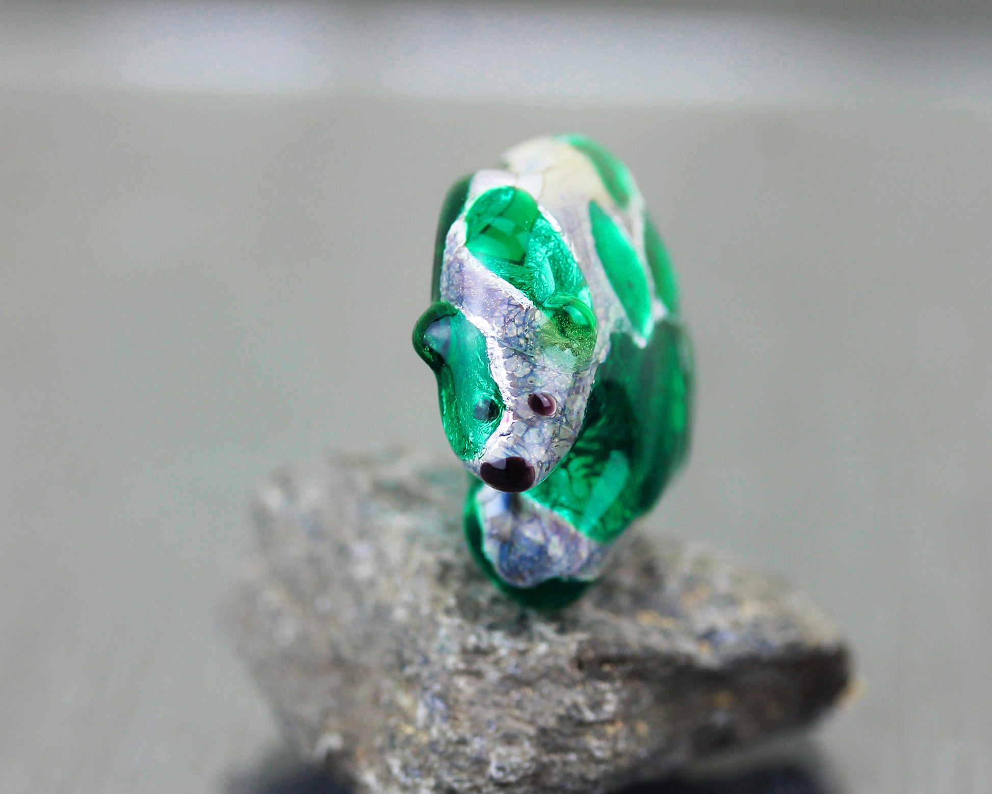 Perle de verre en forme d'ours polaire dans un les tons vert émeraude. Elle est constituée d'une base de couleur gris-beige, qui ressemble à de la pierre grâce à l'incorporation de feuille d'argent fin, décorée d'inclusions de verres transparents colorés. La feuille d'argent scintille sous le verre coloré.