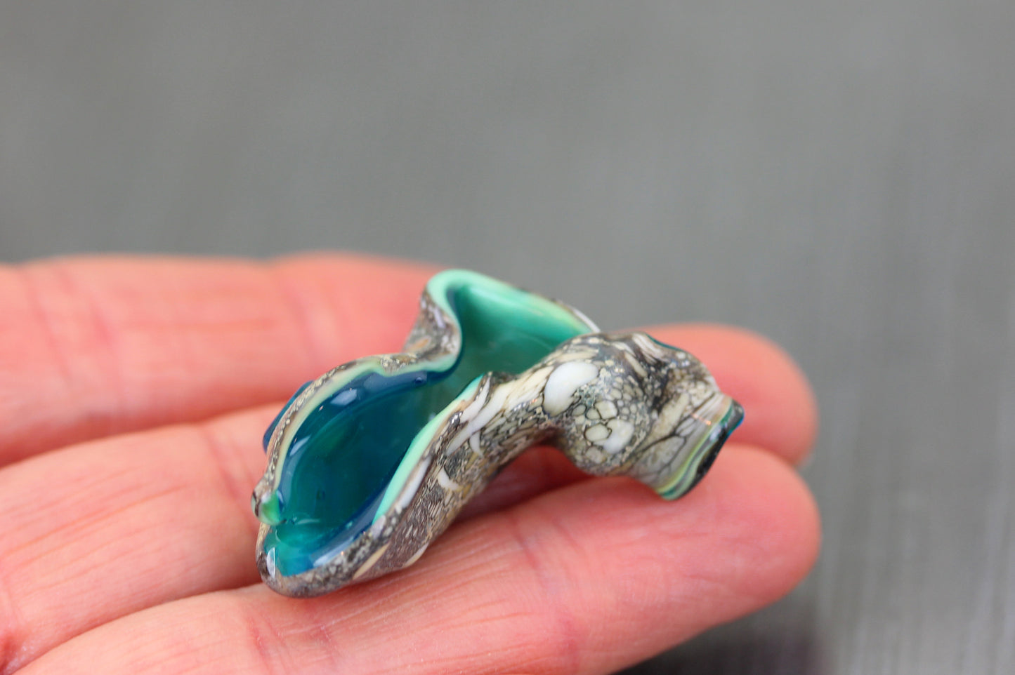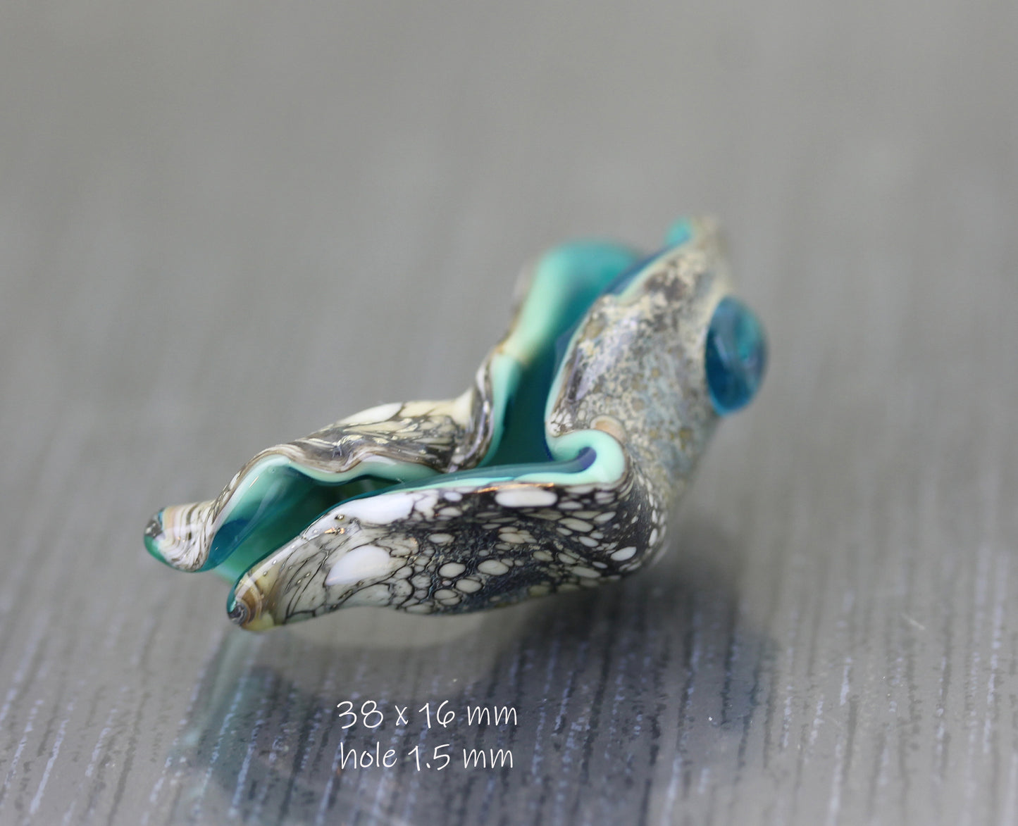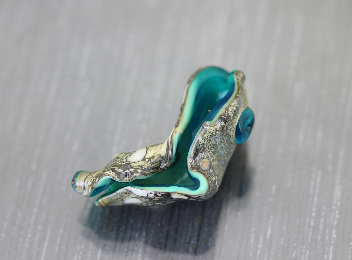 Perle en forme de coquillage de la collection Récif, bleu turquoise à l'intérieur, gris-beige à l'extérieur.