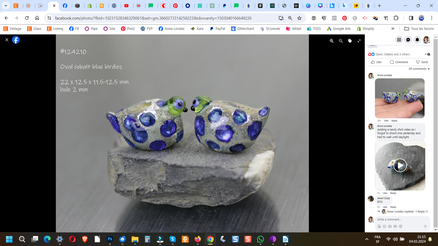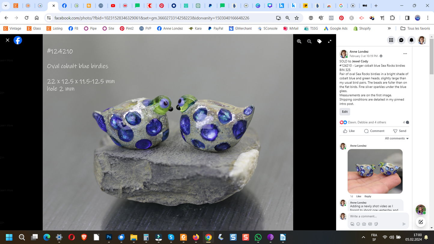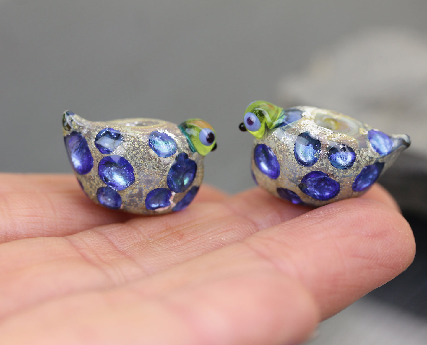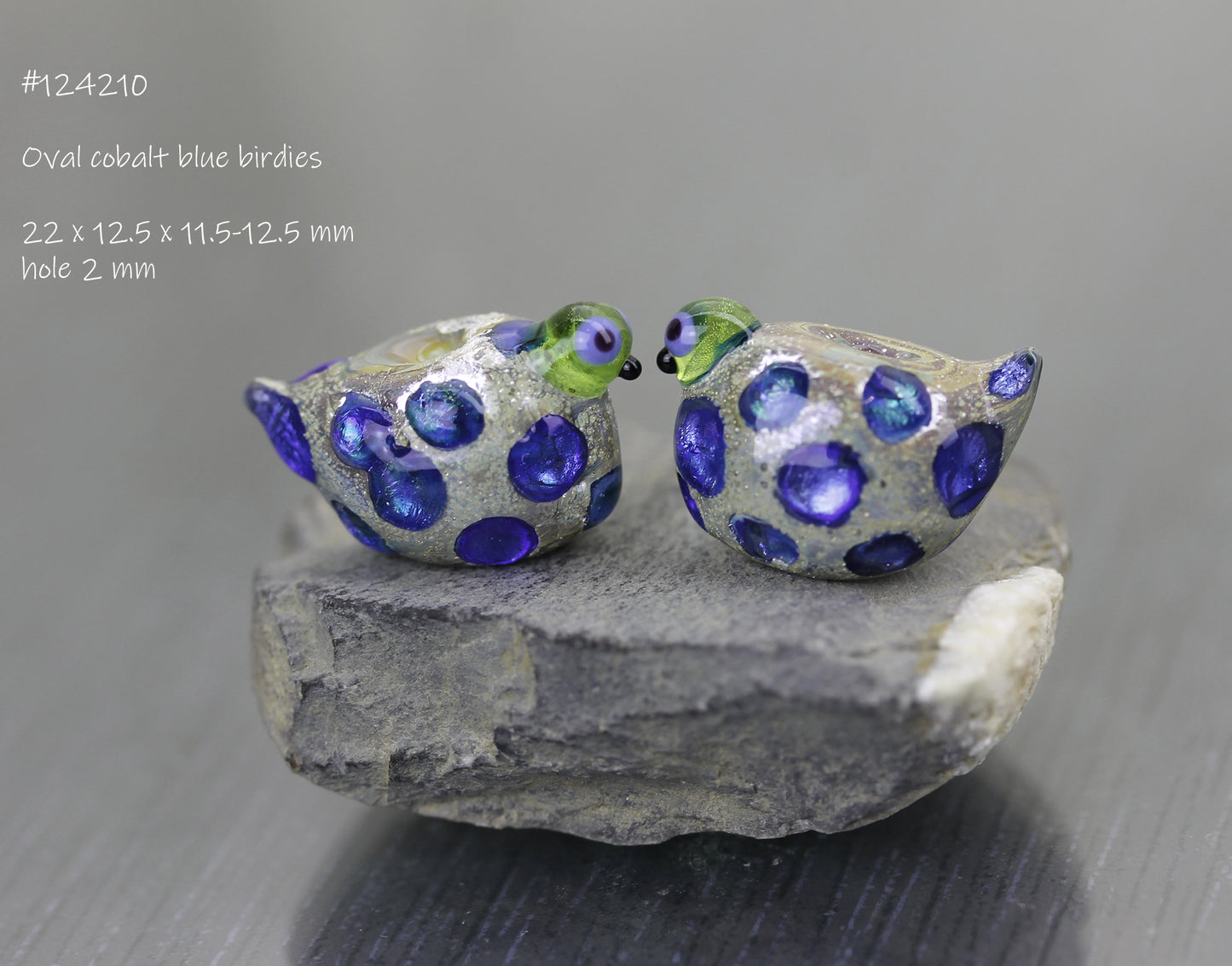 Paire de perles assorties en forme d'oiseaux dodus, issus de la collection Sea Rocks. Cette série s'inspire des flaques d'eau dans les rochers et incorpore de la feuille d'argent fin au verre fondu. Les oiseaux ont un trou vertical et sont décorés d'un motif dans les tons bleu cobalt. De la feuille d'argent scintille sous le verre bleu