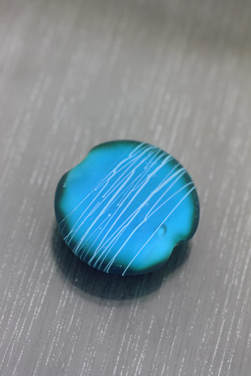 Perles en verre bleu turquoise de la collection Cocon, vendues à l'unité. La base des perles est faite dans un verre opaque, qui est enrobé de verre bleu turquoise transparent. Le filament en verre opaque enroulé autour est un bleu turquoise clair.