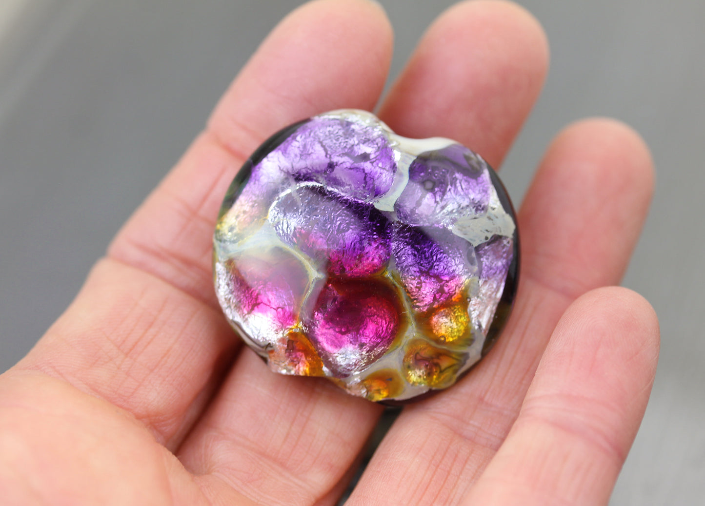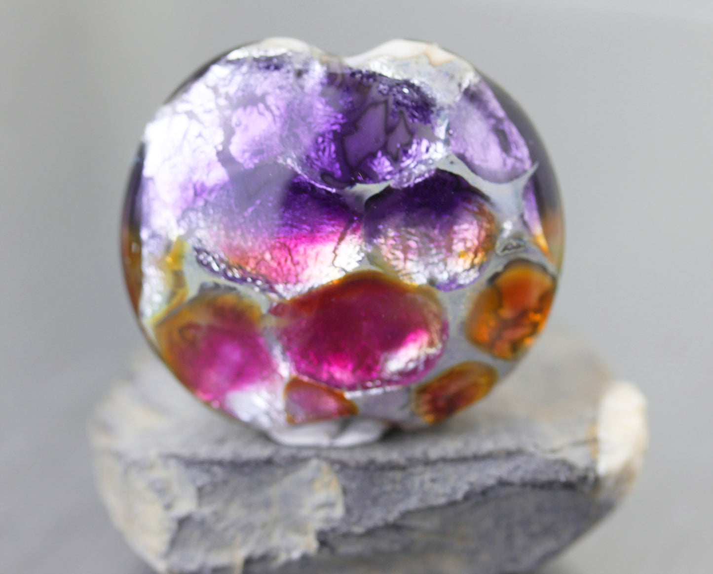 La couleur mixe le rose pêche, le rose vif et le violet, avec des reflets métalliques sous les couleurs. La perle est enrobée d'une épaisse couche de verre transparent, pour ajouter profondeur et lissage.