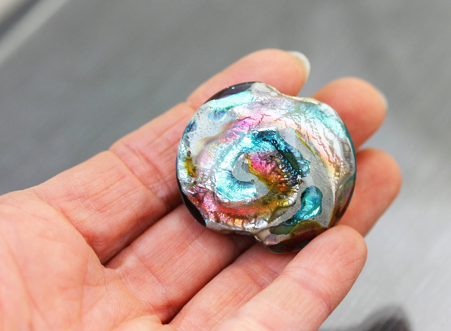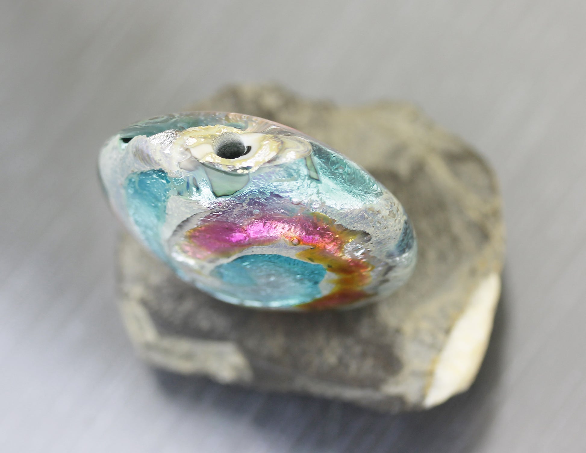 Perle de verre en forme de lentille. Elle est constituée d'une base de couleur gris-beige, qui ressemble à de la pierre grâce à l'incorporation de feuille d'argent fin, parsemée d'inclusions de verre dans un mélange de couleurs bleu turquoise et rose pêche et fuchsia, sous lesquelles scintille discrètement de la feuille d'argent. Elle est enrobée d'une épaisse couche de verre transparent pour ajouter profondeur et lissage.