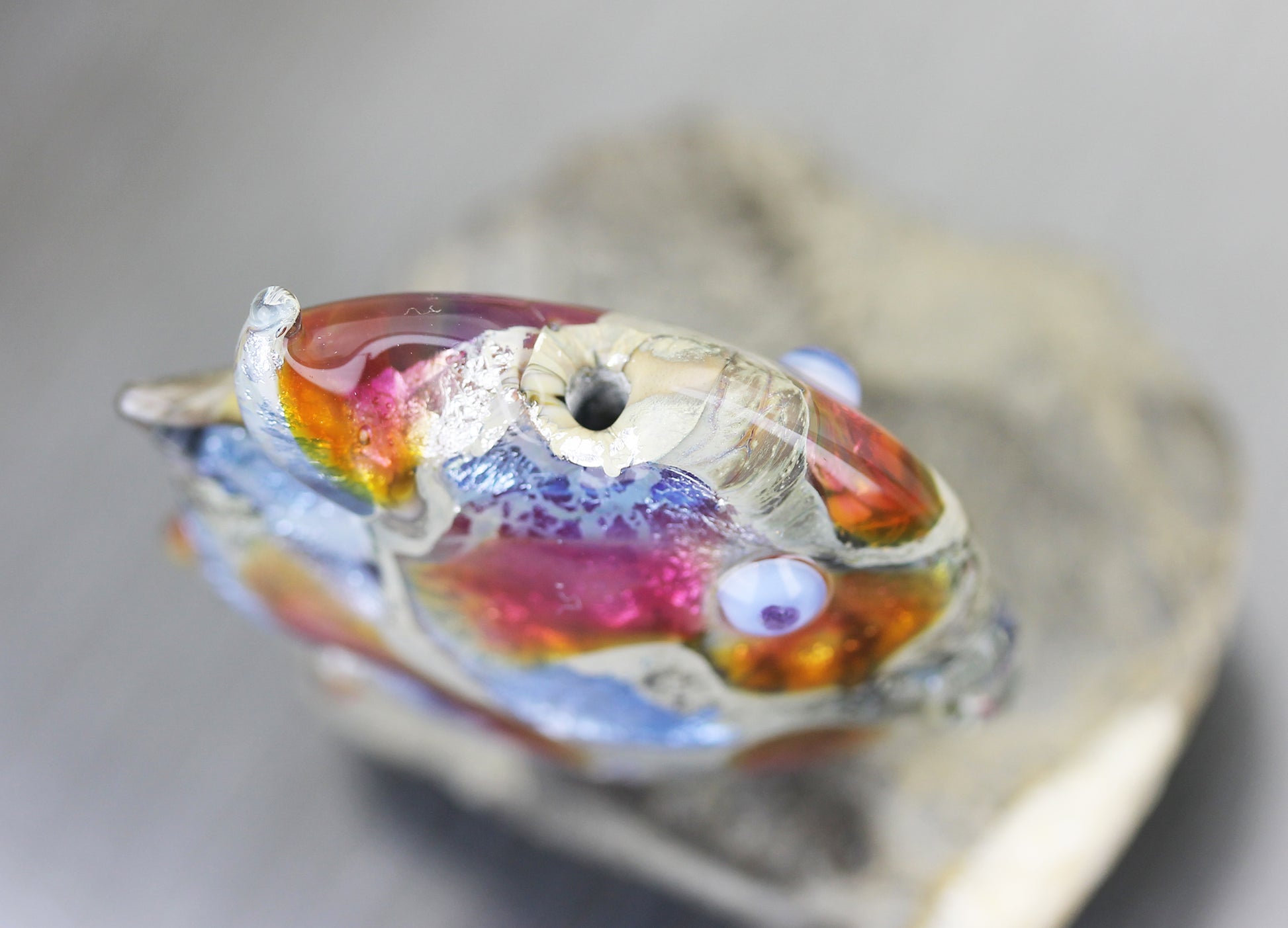 Perle de verre en forme de poisson. Elle est constituée d'une base de couleur gris-beige, qui ressemble à de la pierre grâce à l'incorporation de feuille d'argent fin, parsemée d'inclusions de verre transparent rose, pêche et bleu myosotis sous lesquelles scintille de la feuille d'argent fin.